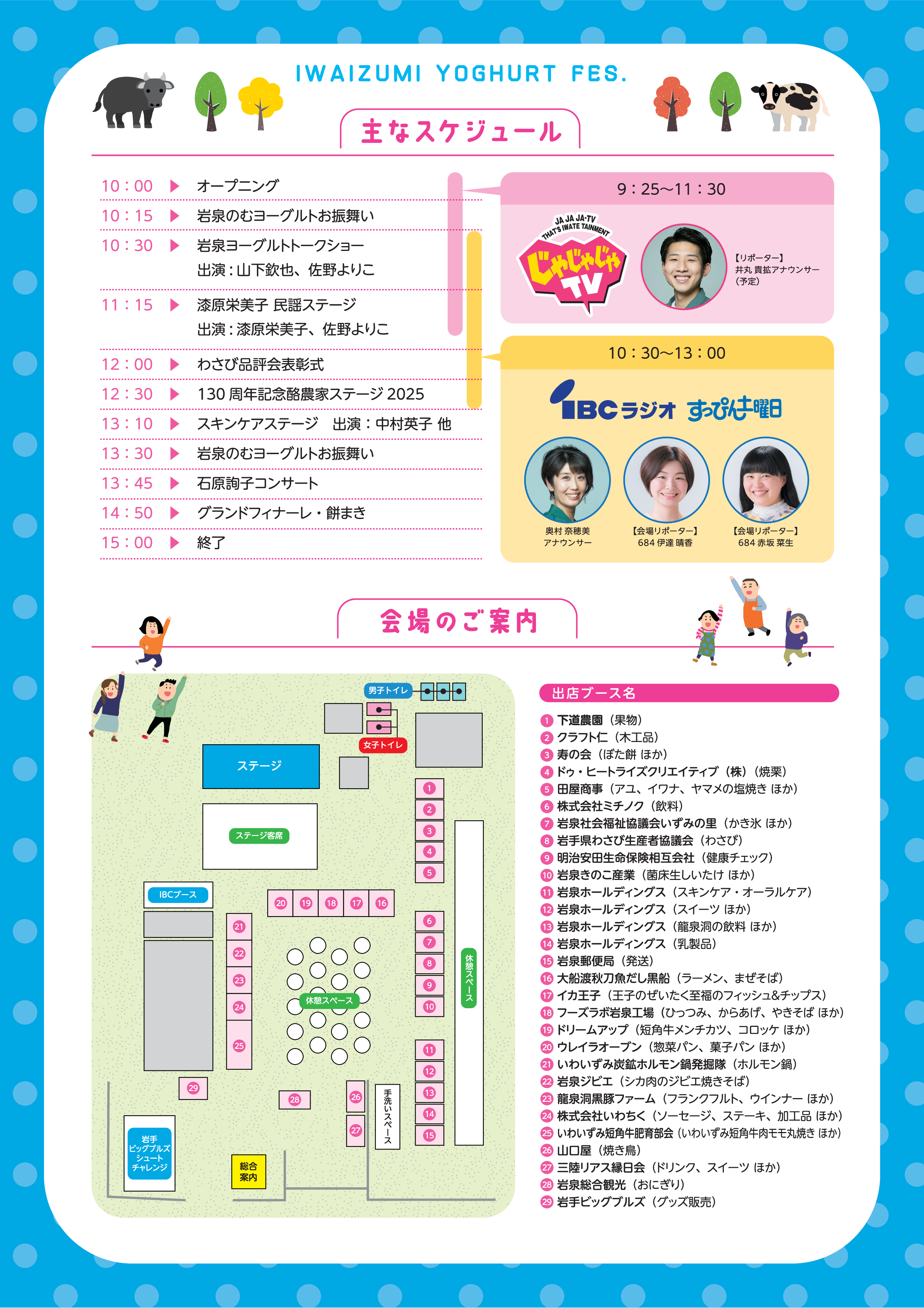 また、いわいずみ短角牛や町内の特産品販売、IBCラジオの公開放送や「じゃじゃじゃTV」の中継も予定されております。